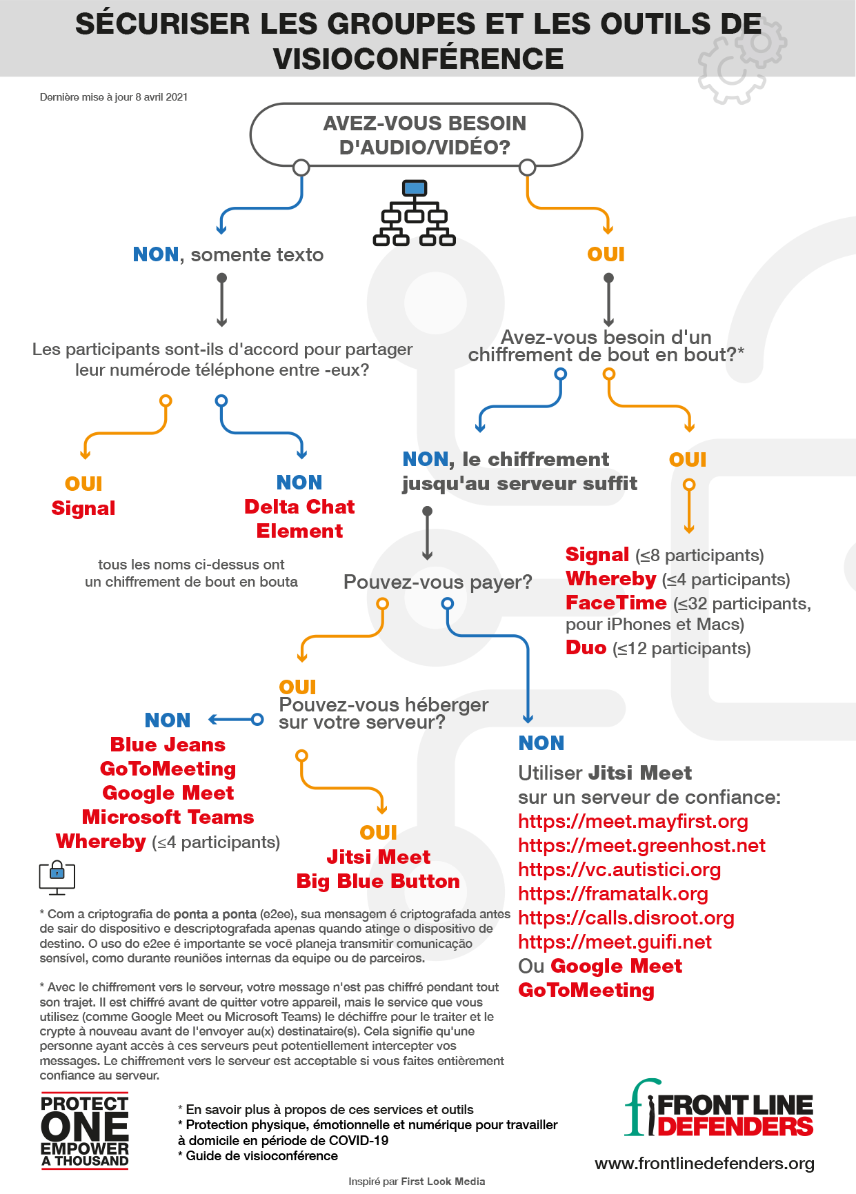 Pourquoi Zoom ou d'autres plateformes / outils ne sont pas cités dans cette liste: De nombreuses plateformes peuvent être utilisées pour les communications de groupe. Dans ce guide, nous nous sommes concentrés sur ceux qui, selon nous, offriront de bonnes expériences aux utilisateurs ainsi que les meilleures fonctionnalités de confidentialité et de sécurité. Bien sûr, aucune des plateformes ne peut offrir 100% de confidentialité ou de sécurité, car toutes les communications comportent une marge de risque. Nous n'avons pas inclus les outils tels que Zoom, Skype, Telegram, WhatsApp etc. dans ce guide, car nous pensons que la marge de risque lors de leur utilisation est trop grande, et donc Front Line Defenders ne souhaite pas les recommander.