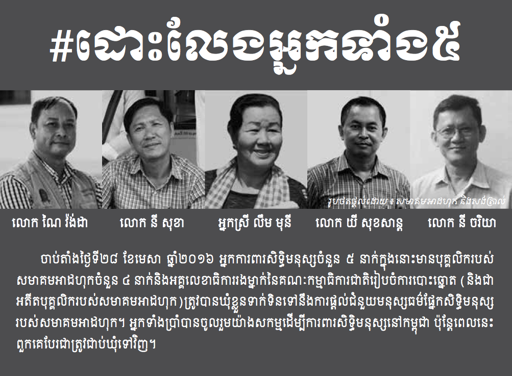 We, the undersigned civil society organizations and non-governmental organizations, launch today – 8 August 2016 – the #FreeThe5KH campaign in support of the five human rights defenders, who are currently in pre-trial detention and under judicial investigation for allegations of bribery. The five face charges in regard to providing advice and legitimate reimbursement of food and transport costs to the woman alleged to have had an extra-marital relationship with the deputy opposition leader, Kem Sokha. The charges have all the hallmarks of being politically motivated, amounting to legal harassment. The five rights defenders have now spent over 100 days in prison (102 days as of today).